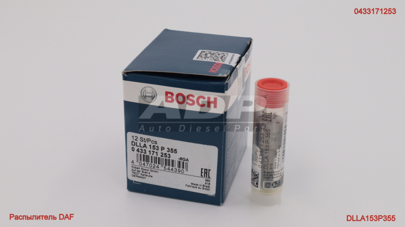 Распылитель DAF 0433171253 (производитель BOSCH) - Розничная цена 4528.75 р., Оптовая цена - по договору. Срок поставки: в наличии и под заказ. Бесплатная доставка по Москве или до транспортной компании. Автозапчасть по каталогу производителя относится к группам: Системы дизельного впрыска, Распылители традиционных систем. Основные характеристики артикула 0 433 171 253: размеры (17/17/66/) мм., вес - 0.027 кг., объем - 0.019 л.. Применяется на следующих марках: DAF. Применяется на следующих моделях: 75-Serie. Артикулы OEM: DAF - 1275638. Фото: 0433171253.