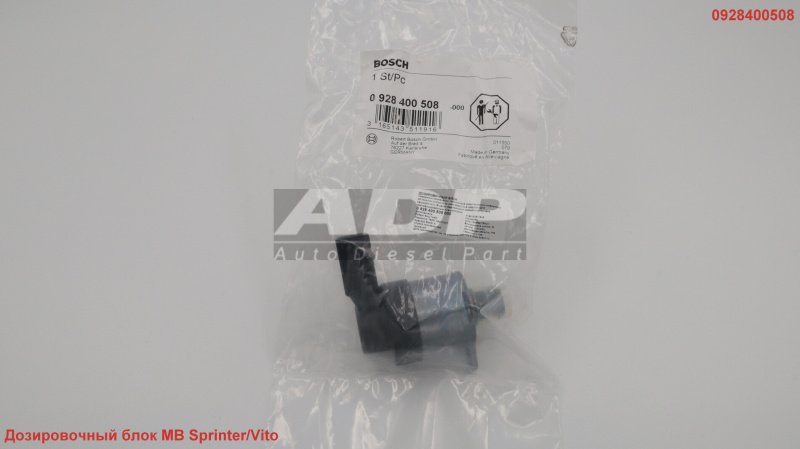 Дозировочный блок MB Sprinter/Vito (Регулятор давления топлива) 0928400508 (производитель BOSCH) - Розничная цена 6304.56 р., Оптовая цена - по договору. Срок поставки: в наличии и под заказ. Бесплатная доставка по Москве или до транспортной компании. Автозапчасть по каталогу производителя относится к группам: Системы дизельного впрыска, Дизельные запасные части (современные системы). Основные характеристики артикула 0 928 400 508: размеры (89/49/49/) мм., вес - 0.195 кг., объем - 0.214 л.. Применяется на следующих марках: MERCEDES-BENZ. Применяется на следующих моделях: C-Klasse; CLC-Klasse; CLK-Klasse; E-Klasse; S-Klasse; Sprinter; Sprinter Classic; Viano; Vito. Артикулы OEM: MERCEDES-BENZ - 6460740084, MERCEDES-BENZ - A6460740084. Фото: 0928400508.
