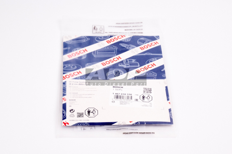 Комлпект деталей (кольца) 1467010316 (производитель BOSCH) - Розничная цена 1150.00 р., Оптовая цена - по договору. Срок поставки: в наличии и под заказ. Бесплатная доставка по Москве или до транспортной компании. Автозапчасть по каталогу производителя относится к группам: Системы дизельного впрыска, Дизельные запасные части (традиционные системы). Основные характеристики артикула 1 467 010 316: размеры (269/169/9/) мм., вес - 0.118 кг., объем - 0.409 л.. Фото: 1467010316.
