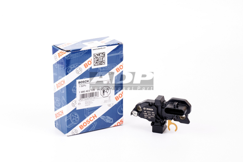Регулятор генератора 1986AE0105 (производитель BOSCH) - Розничная цена 4125.00 р., Оптовая цена - по договору. Срок поставки: в наличии и под заказ. Бесплатная доставка по Москве или до транспортной компании. Автозапчасть по каталогу производителя относится к группам: Стартеры и генераторы, Регуляторы. Основные характеристики артикула 1 986 AE0 105: вес - 0.092 кг., Фото: 1986AE0105.